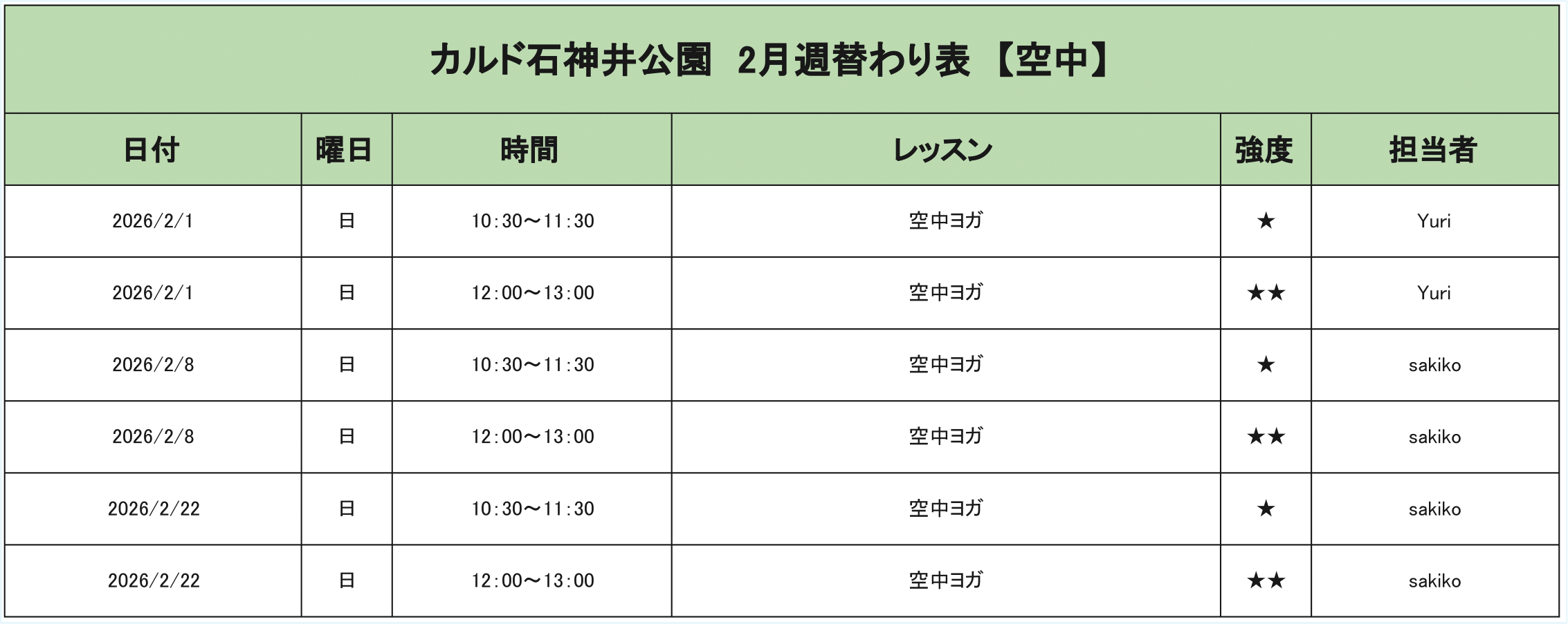 カルド石神井公園では、定員8名という少人数でのレッスンを行っています。インストラクターとの距離も近く、アットホームな雰囲気で空中ヨガをお楽しみいただけます。一人ひとりをしっかりとサポートしながらレッスンを進めていきますので、初心者の方も安心してご参加ください。また、インストラクターによってレッスンの内容や雰囲気が異なるのもカルド石神井公園ならでは。その日の気候や一人ひとりのコンディションに合わせてレッスンを行っています。初心者向けのビギナークラスから、アロマを使用したクラス、ダイナミックな動きを取り入れたアドバンスクラスなど、ご自身の体調や気分に合わせて好きなクラスをお選びいただけます。ご希望があれば、レッスン後にポーズをとって写真を撮ることも可能です。お気に入りのウェアで空中ヨガをお楽しみください。