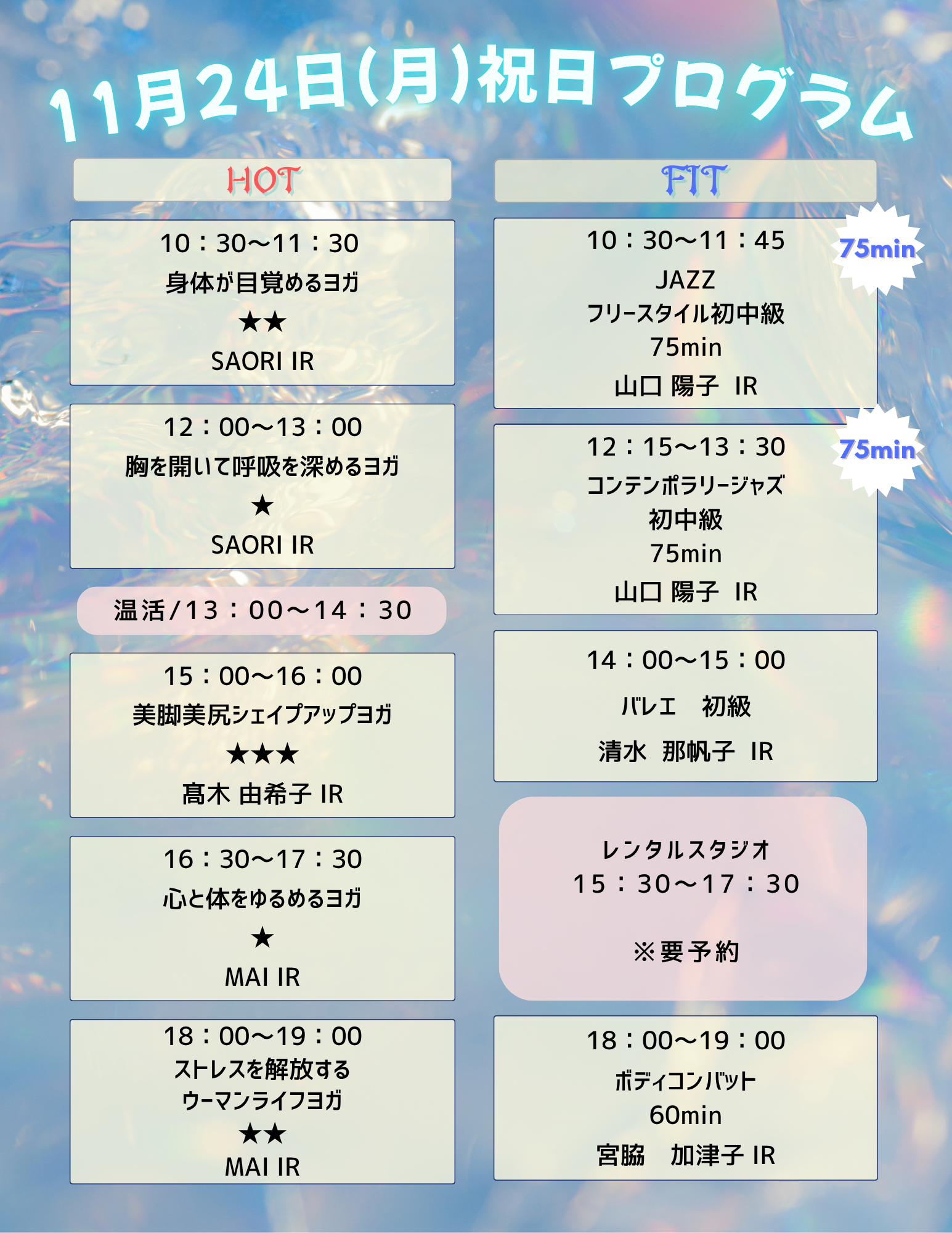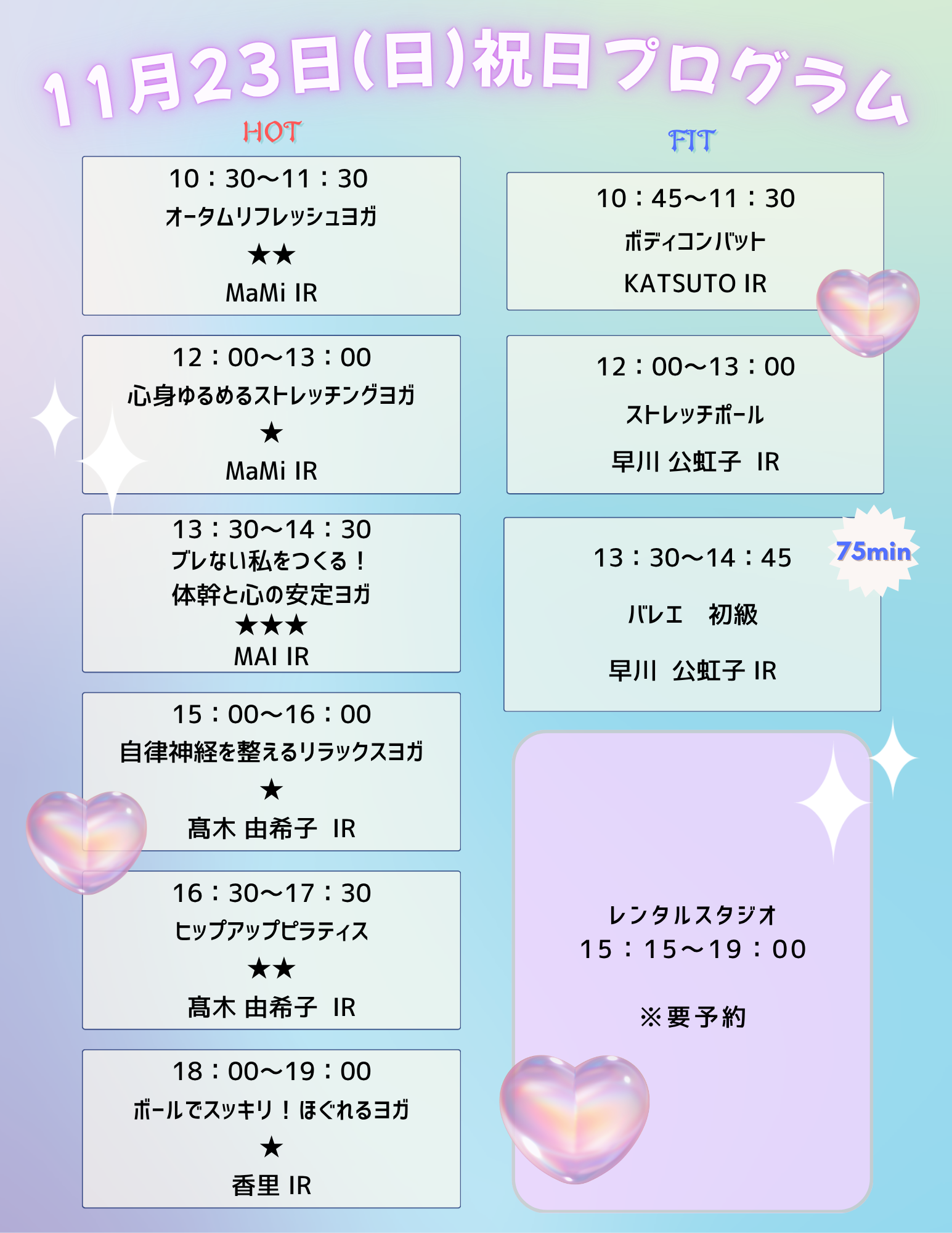 ホットヨガによる血液やリンパの流れを促進する効果に加え、ホルモンバランスの安定や美肌効果、たるみ解消など、さまざまな角度からのボディケアを目的としたプログラムです。難度は低めに設定していますので、初心者でも安心して受講することができます。