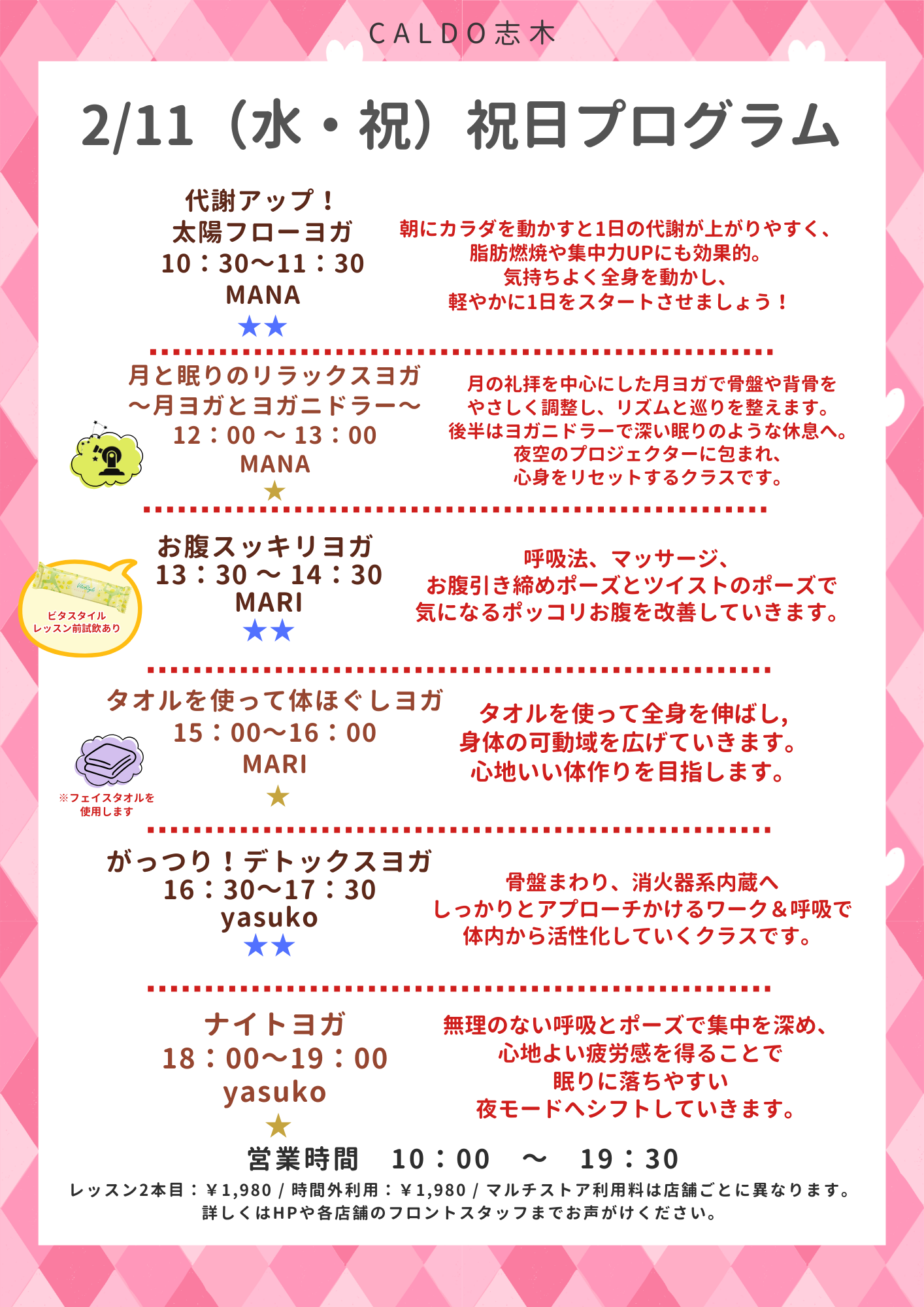 ホットヨガによる血液やリンパの流れを促進する効果に加え、ホルモンバランスの安定や美肌効果、たるみ解消など、さまざまな角度からのボディケアを目的としたプログラムです。難度は低めに設定していますので、初心者でも安心して受講することができます。