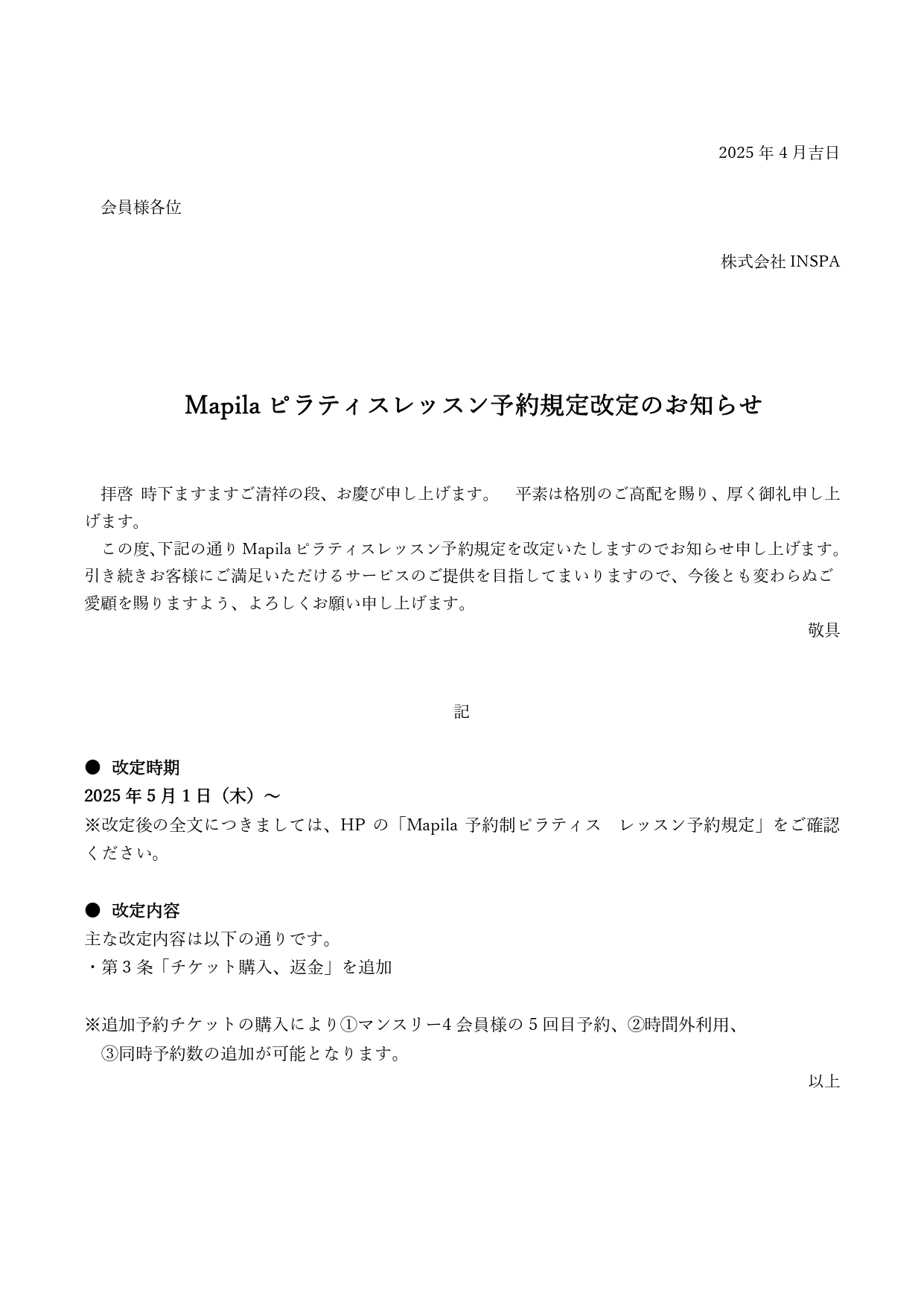 Mapila ピラティスレッスン予約規定改定のお知らせ