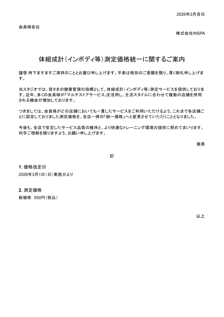 【重要】体組成計(インボディ)測定価格統一に関するご案内