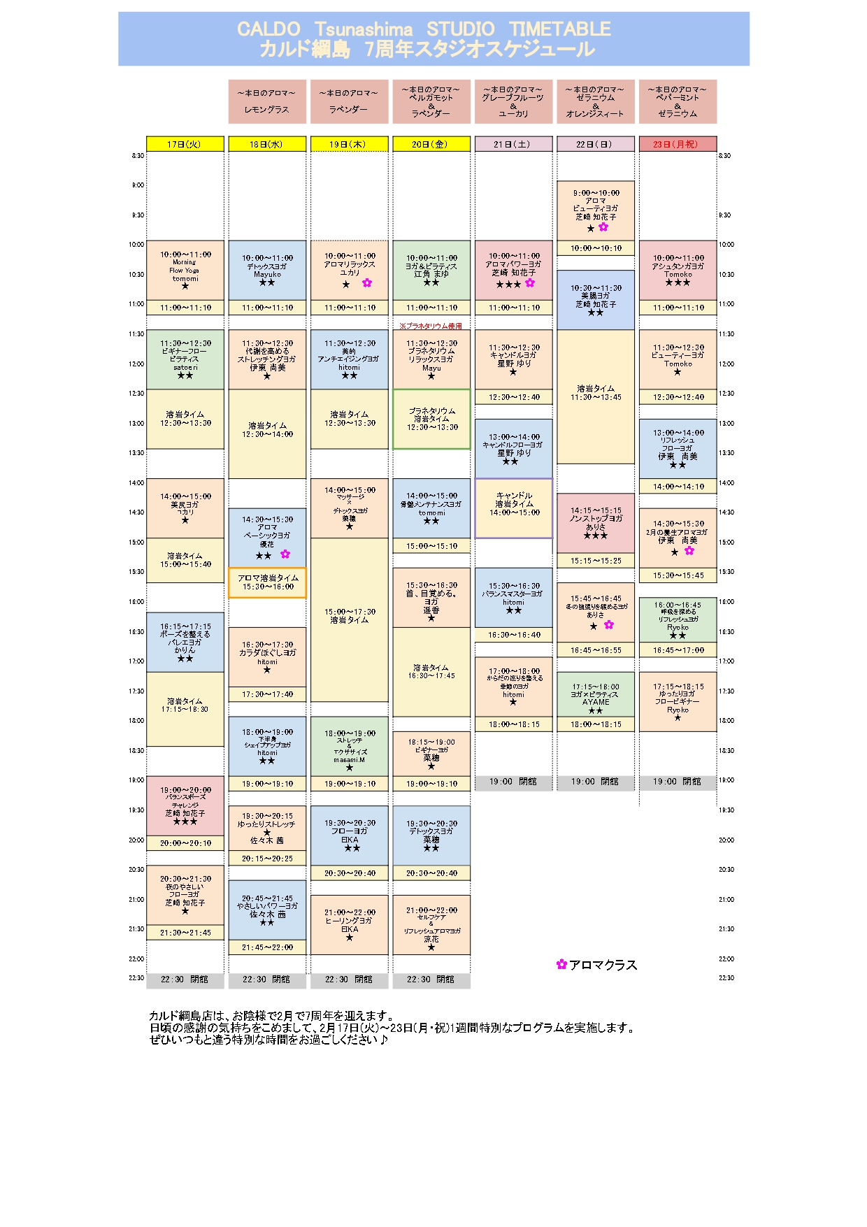 プログラム内容、インストラクターに毎週変更のあるクラスです。 別途、週替わりレッスン(PDF)をご確認ください。