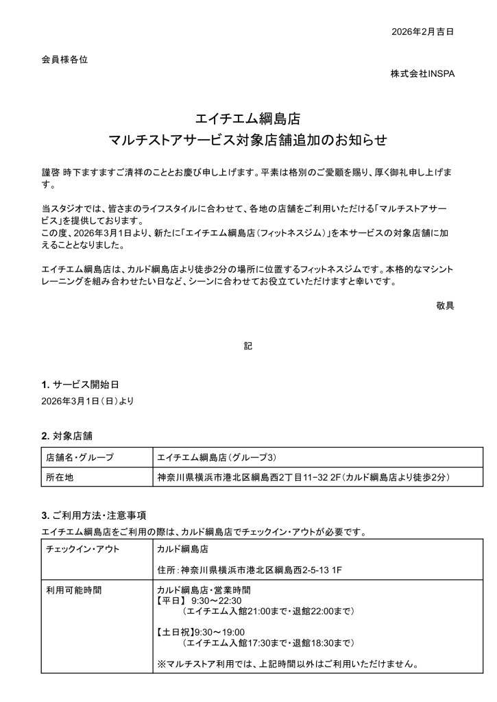 エイチエム綱島店 マルチストアサービス対象店舗追加のお知らせ